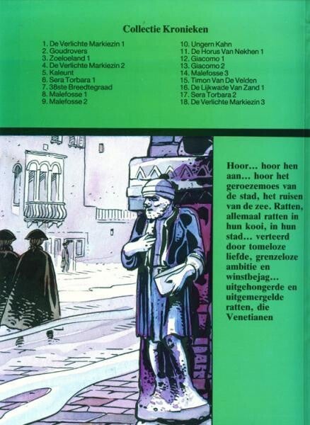 Hoor... hoor hen aan... hoor het geroezemoes van de stad, het ruisen van de zee. Ratten, allemaal ratten in hun kooi, in hun stad... verteerd door tomeloze liefde, grenzeloze ambitie en winstbejag... uitgehongerde en uitgemergelde ratten, die Venetianen.